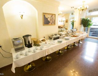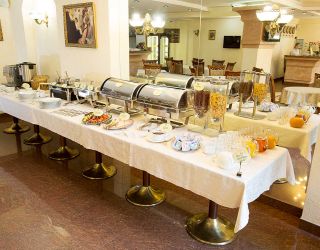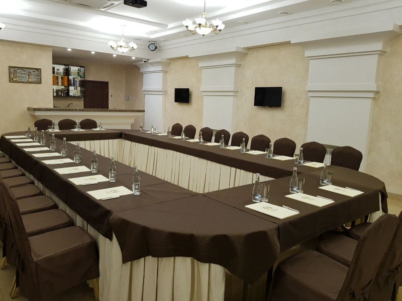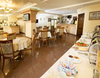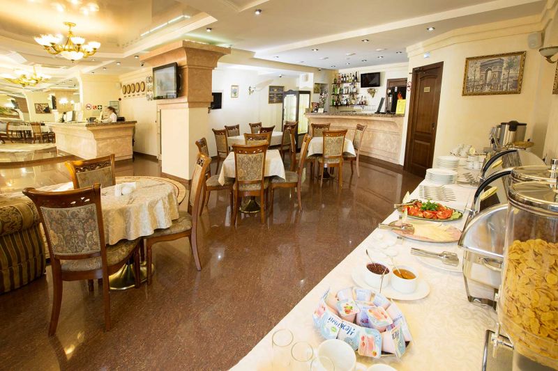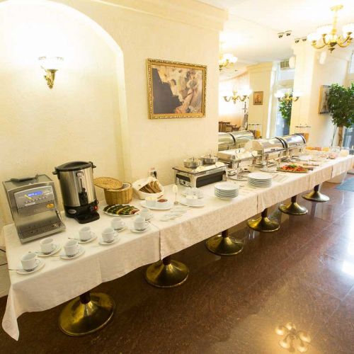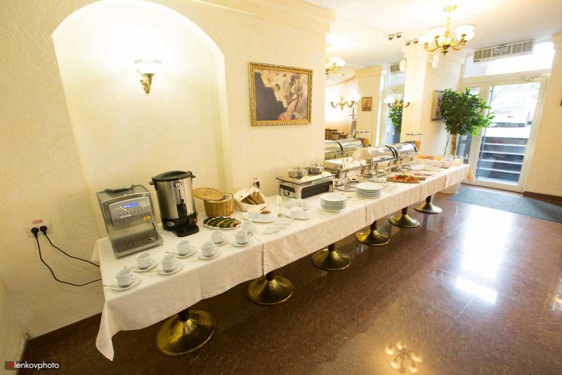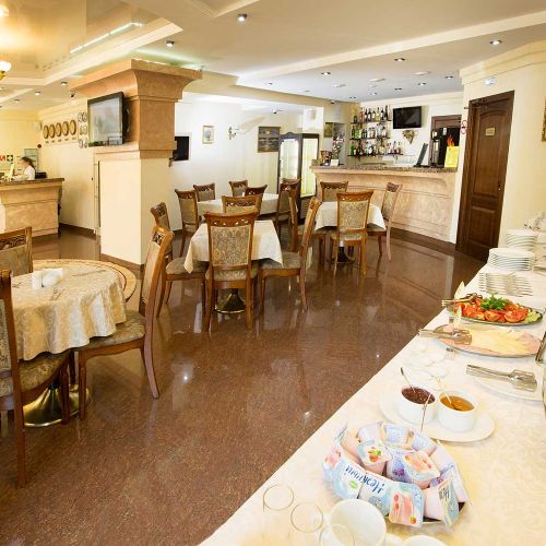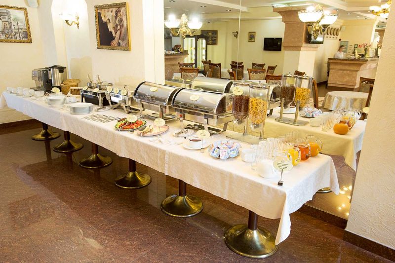В отеле работает ресторан, где подают блюда русской, европейской и испанской кухонь. По утрам для гостей сервируют завтраки, днём предлагают бизнес-ланчи. Для массовых торжеств предусмотрен банкетный зал на 40 человек.